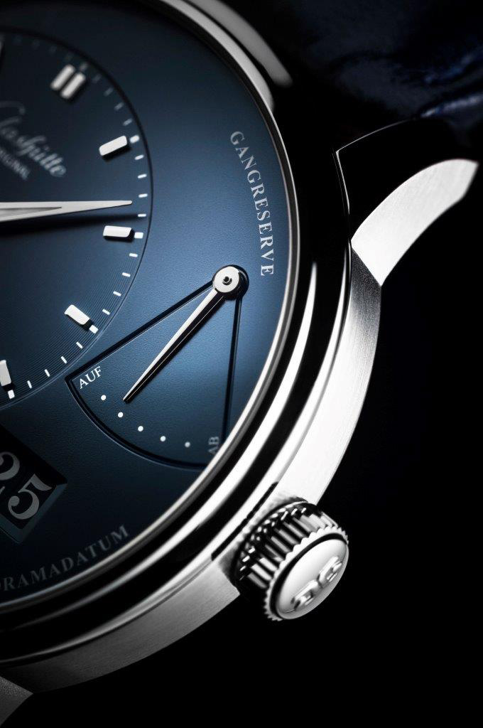 Mit einer überdimensionierten Datumsanzeige und einer Gangreserve wird der PanoReserve manuell mit einer 42-stündigen Gangreserve gewickelt. Die Bewegung ist im Stil der Glashütte (die Stadt, nicht die Marke) gebaut. Es hat eine dreiviertel Platte, verschraubte Goldchatons und einen gravierten Balance Hahn.